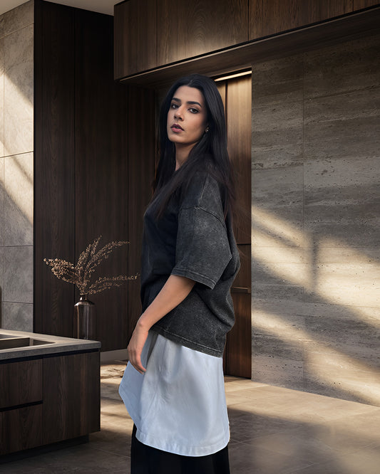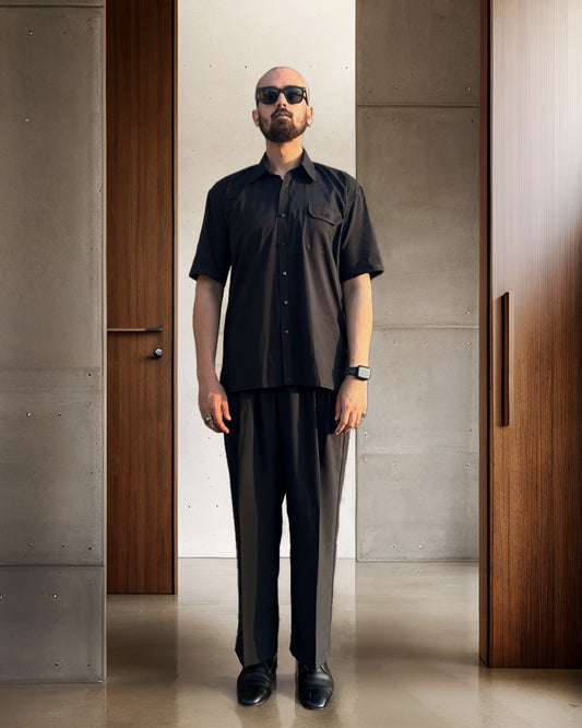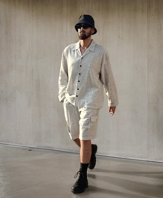 "Introducing 'Boardroom Basics', a meticulously crafted collection designed for the modern professional. Our palette is anchored in classic hues, complementing the polished aesthetic of collared shirts paired effortlessly with tailored baggy pants and chic shorts.