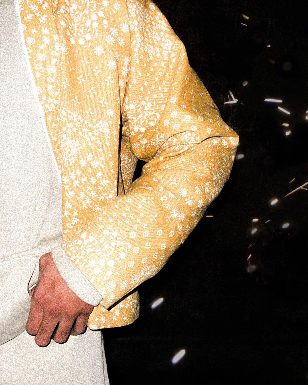 Introducing the Arabesque Jacket, an unparalleled and distinctive garment that harmonizes a vibrant mustard hue with an intricate floral block print.