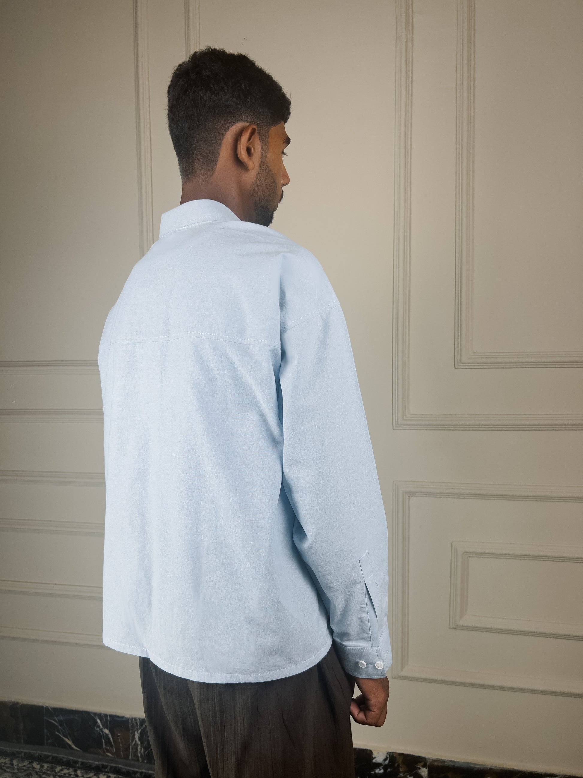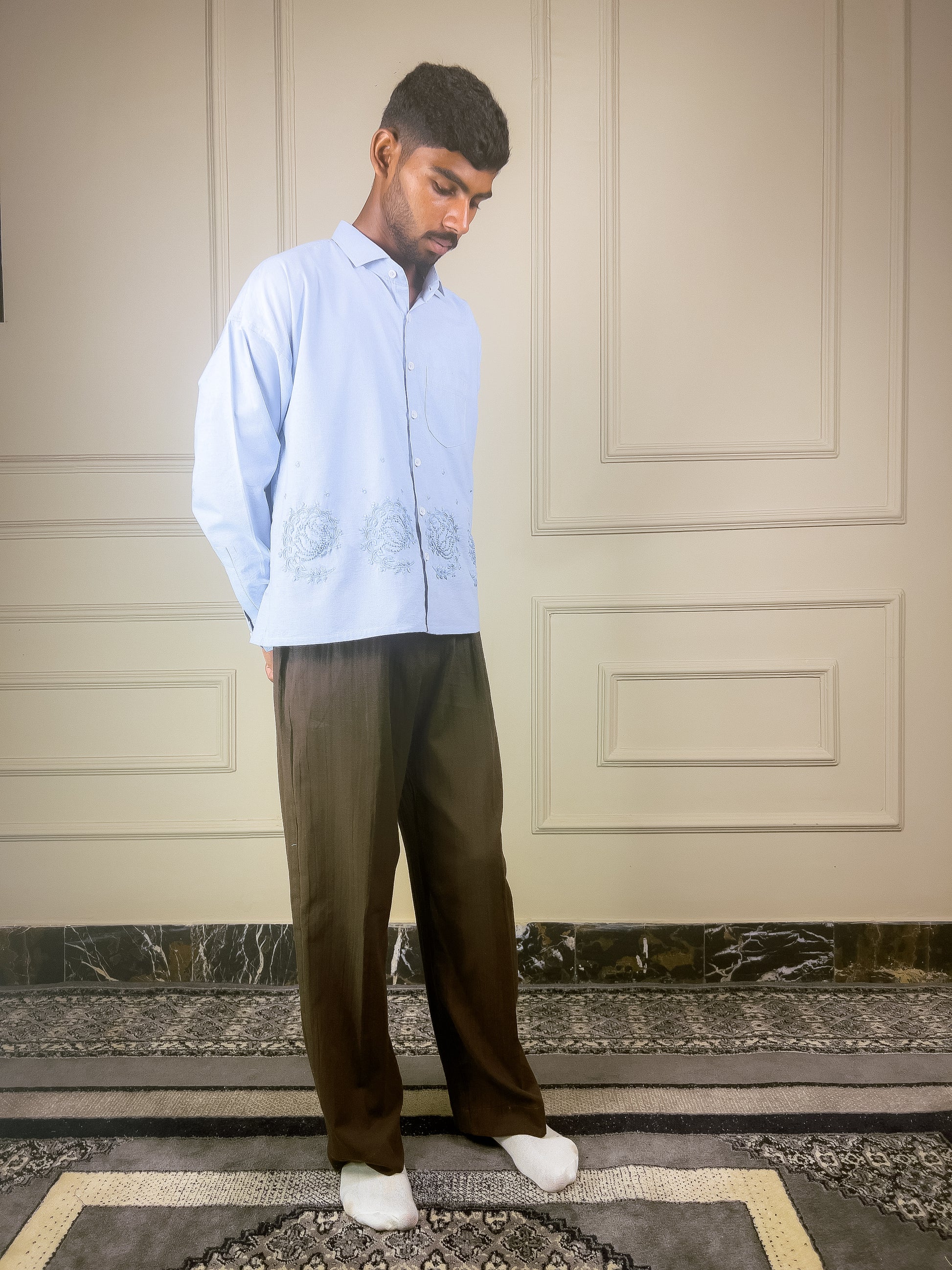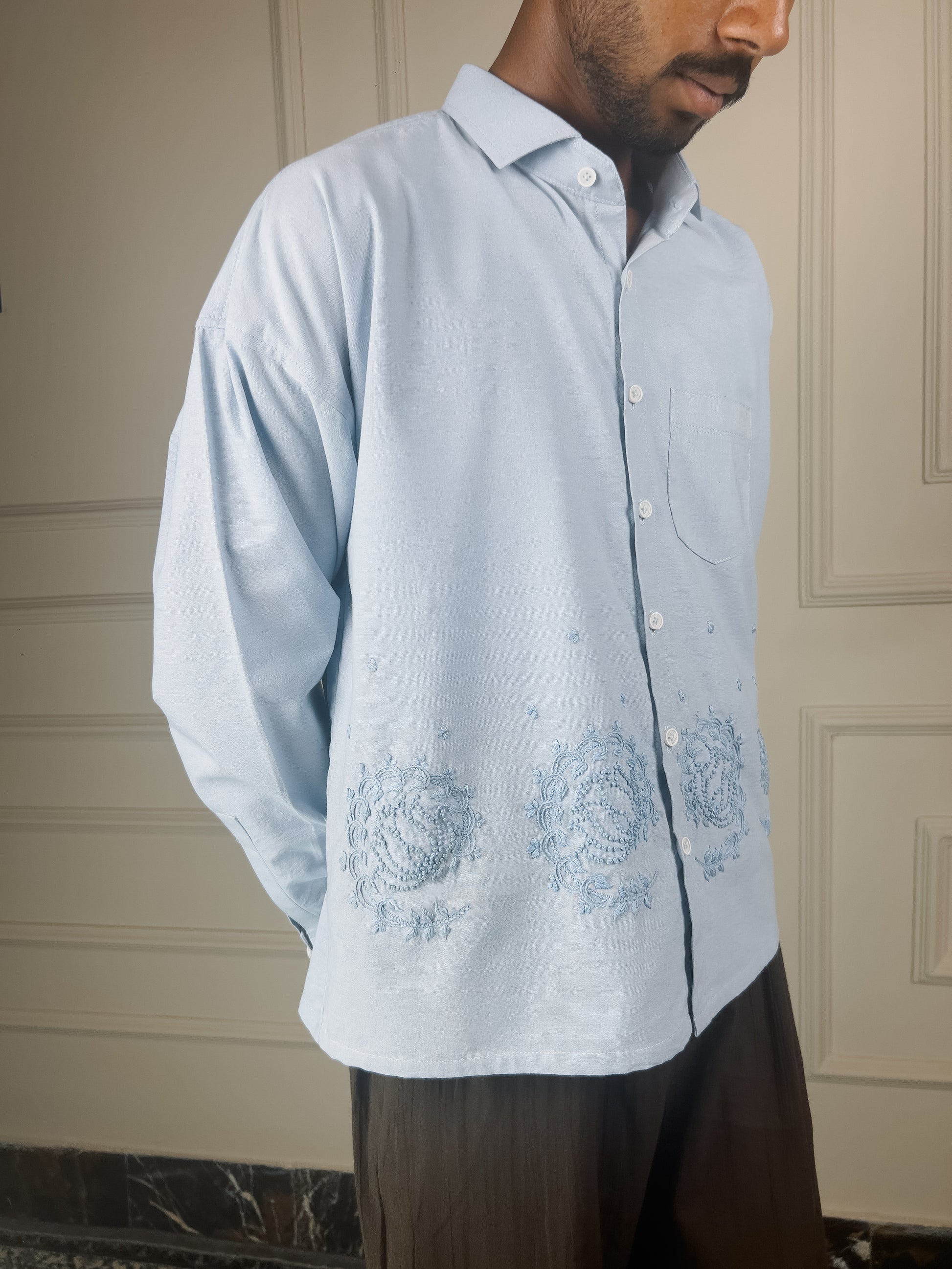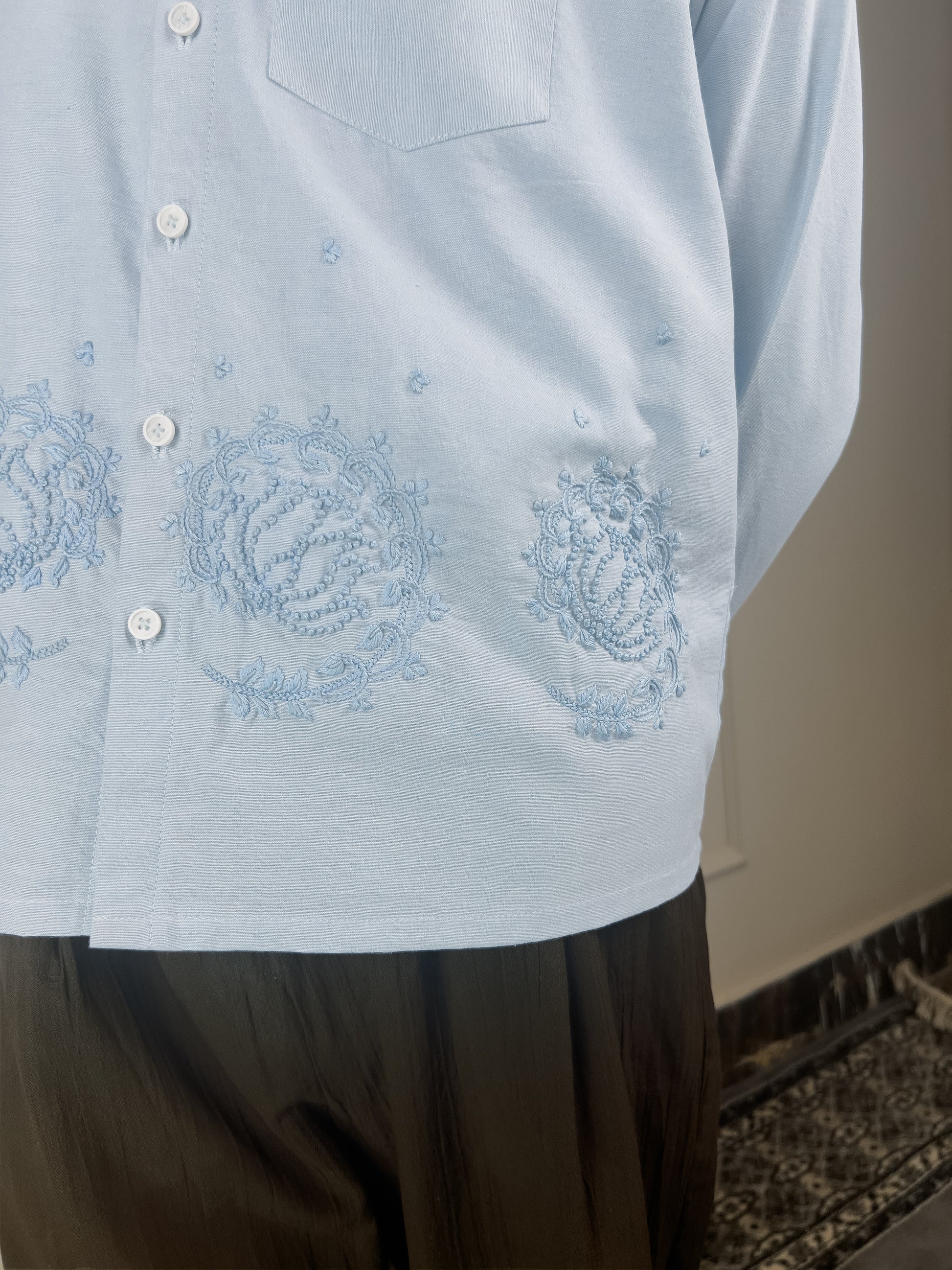 The Bindu Hand Embroidered Boxy Shirt offers a modern cropped silhouette elevated by timeless craftsmanship. With fine hand embroidery along the front hem, it’s a quiet nod to tradition within a fashion-forward frame.