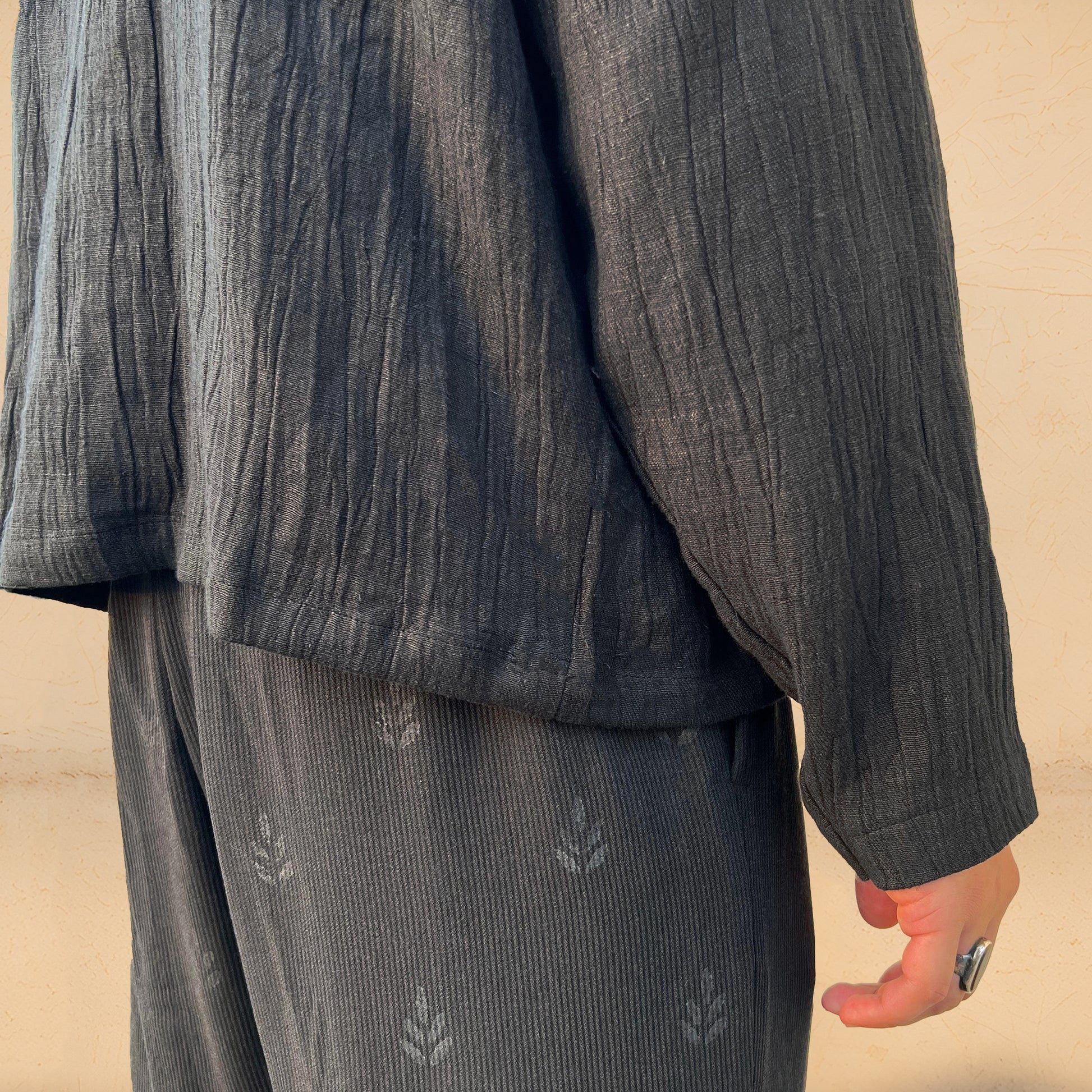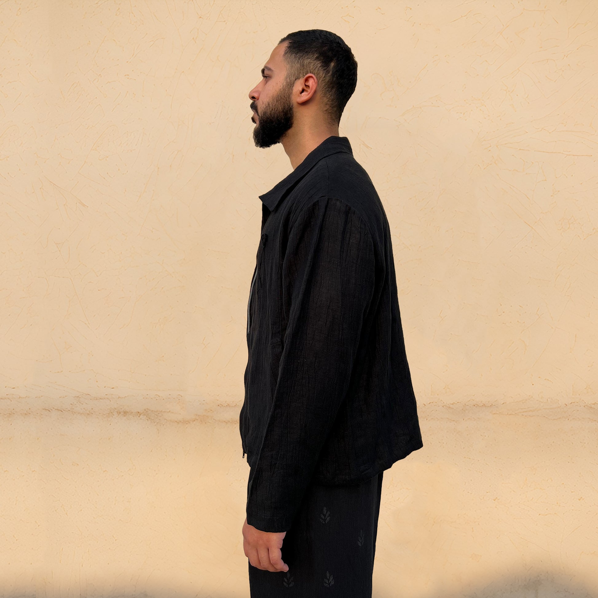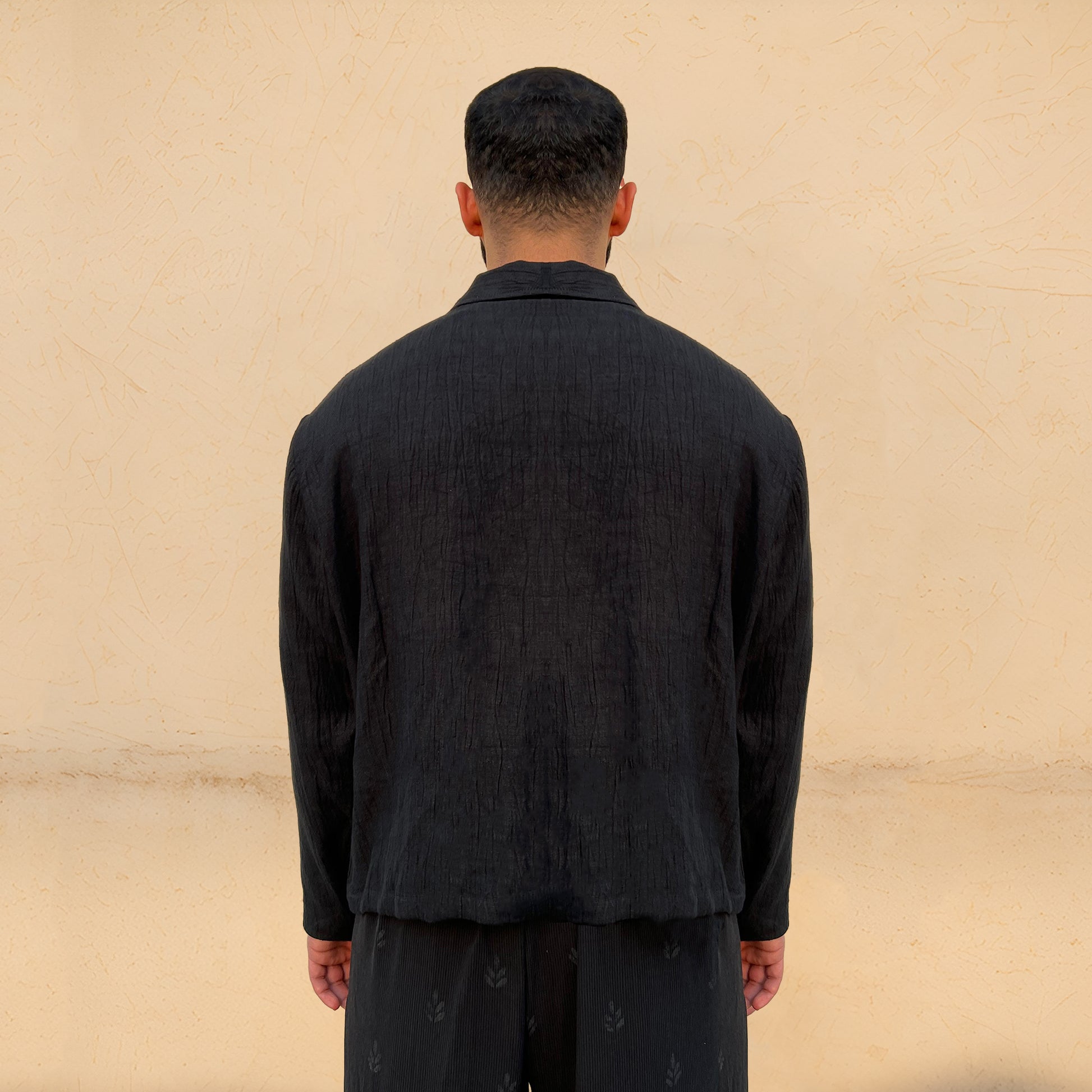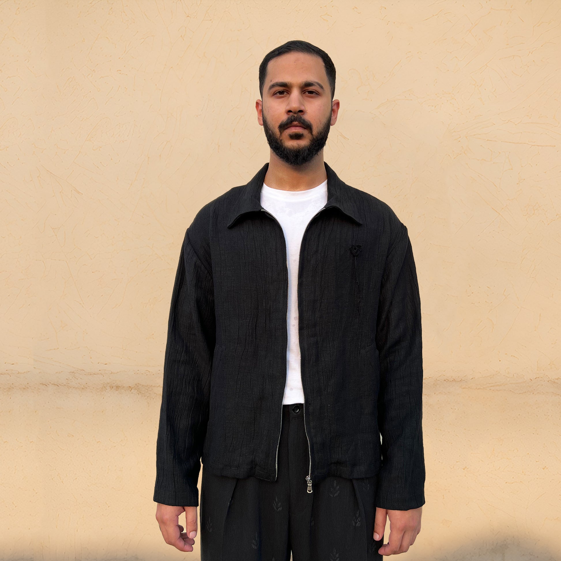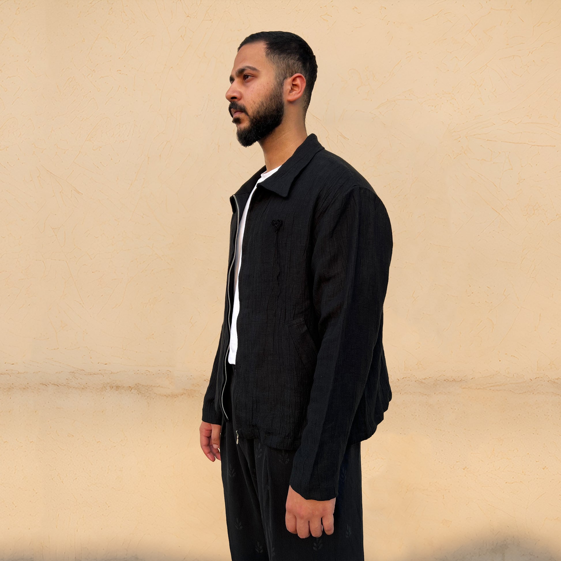 The Black Heart Jacket showcases a crushed texture, accented by a hand-crocheted heart for an artisanal touch. It blends subtle style with personal, crafted detail, perfect for contemporary looks.