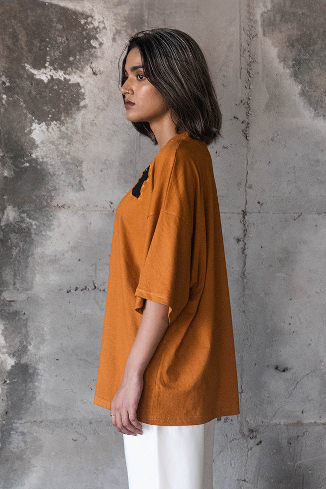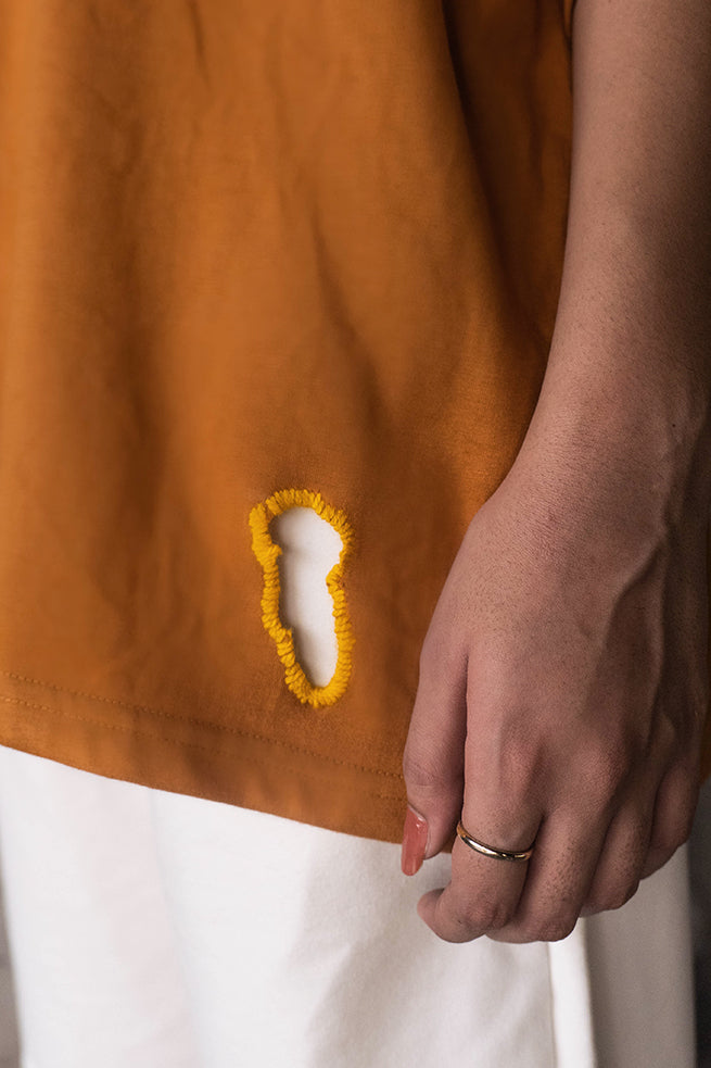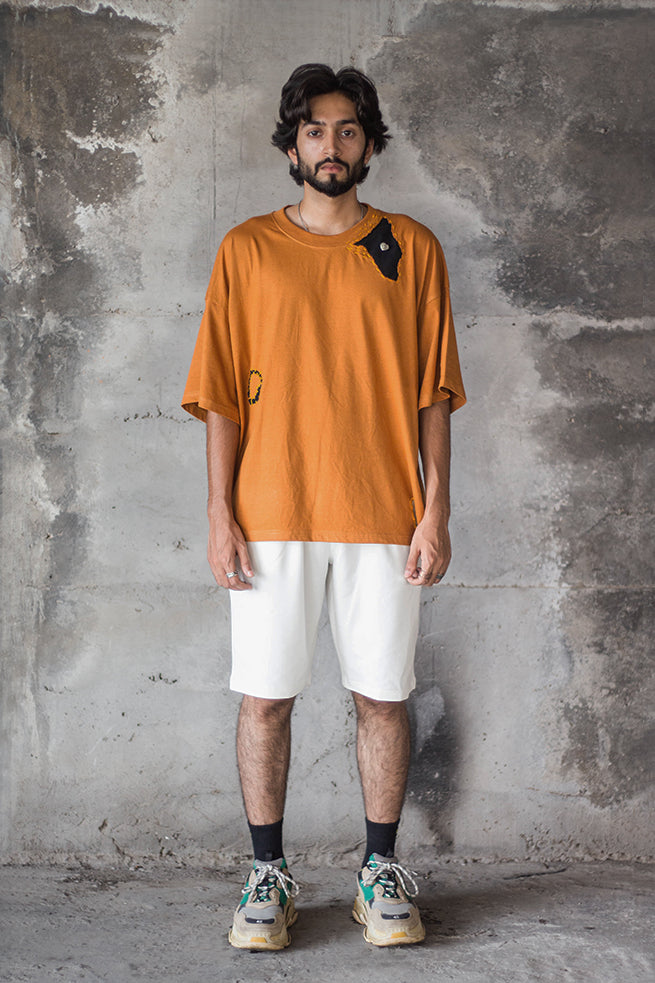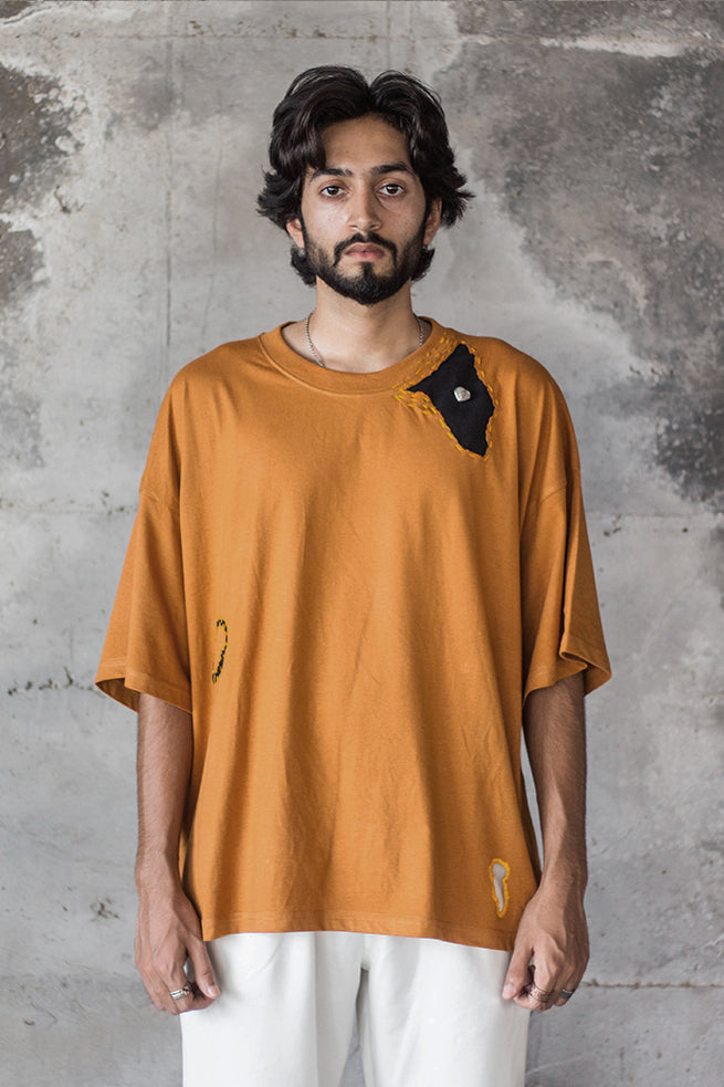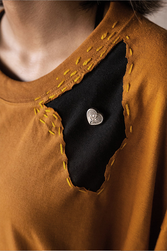 Cemetery t–shirt, a true masterpiece of art and fashion. This half-sleeved t-shirt features a stunning silver-plated jewel art piece,made in collaboration with zrgr.co , is meticulously hand-stitched onto the fabric. The running stitch with contrast patches all over the t-shirt, inspired by the Japanese philosophy of wabi-sabi, adds a unique touch to this uni-sex, oversized garment.