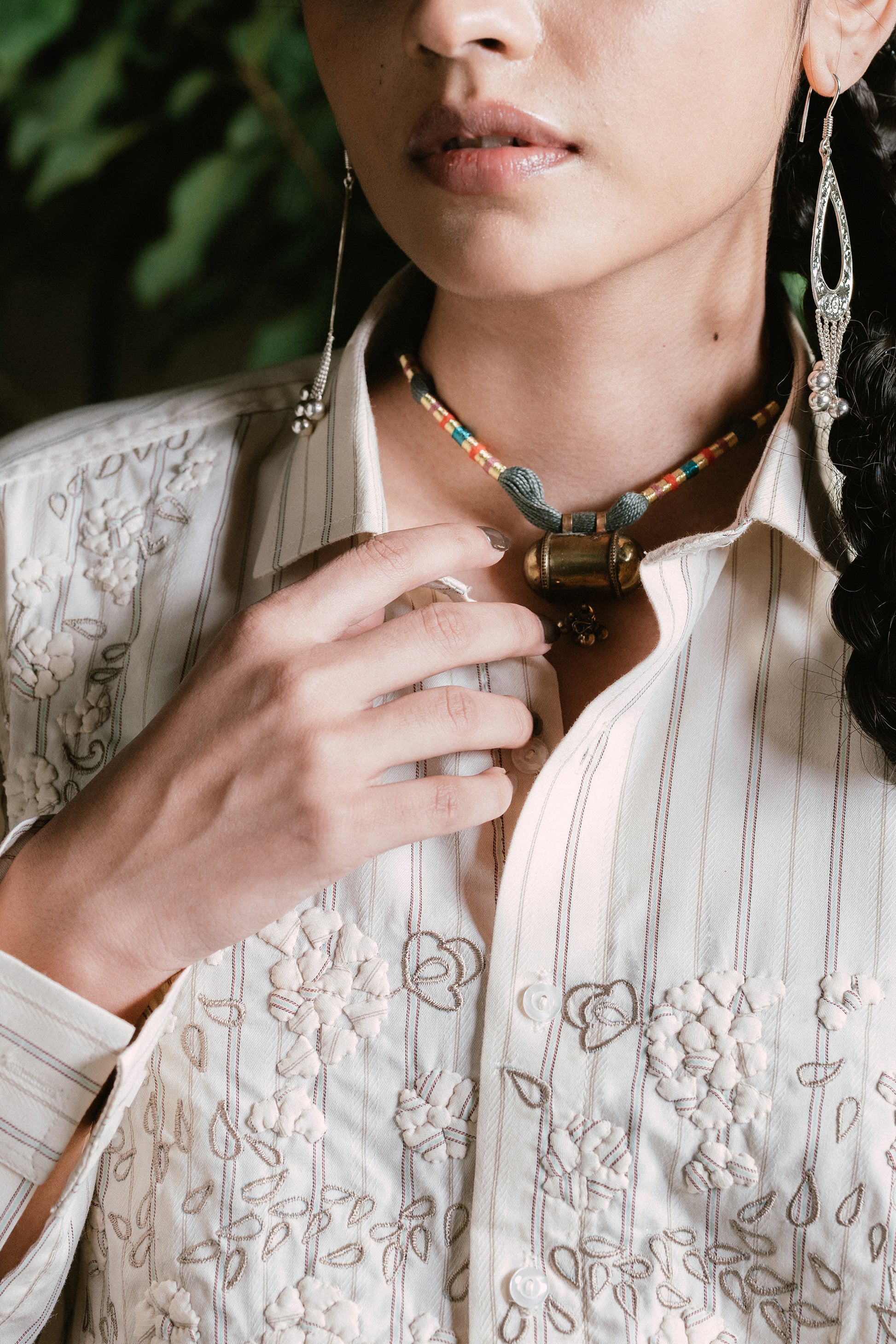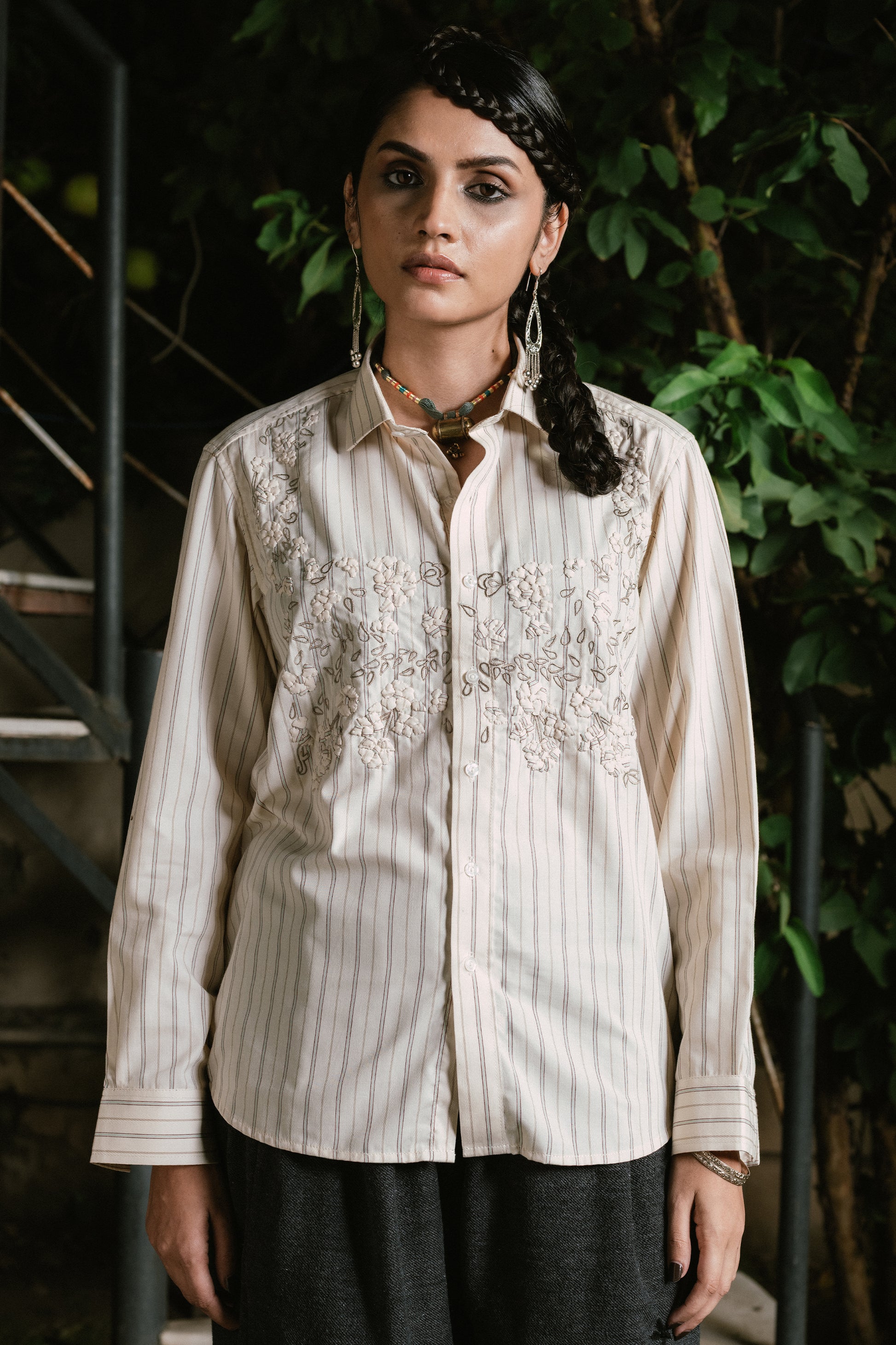 The Choli Hand Appliqued Shirt takes inspiration from the traditional South Asian choli, reimagined into a refined contemporary silhouette. Crafted from soft cotton and detailed with hand applique by artisans of Rahim Yar Khan, it bridges cultural nostalgia with modern craftsmanship.