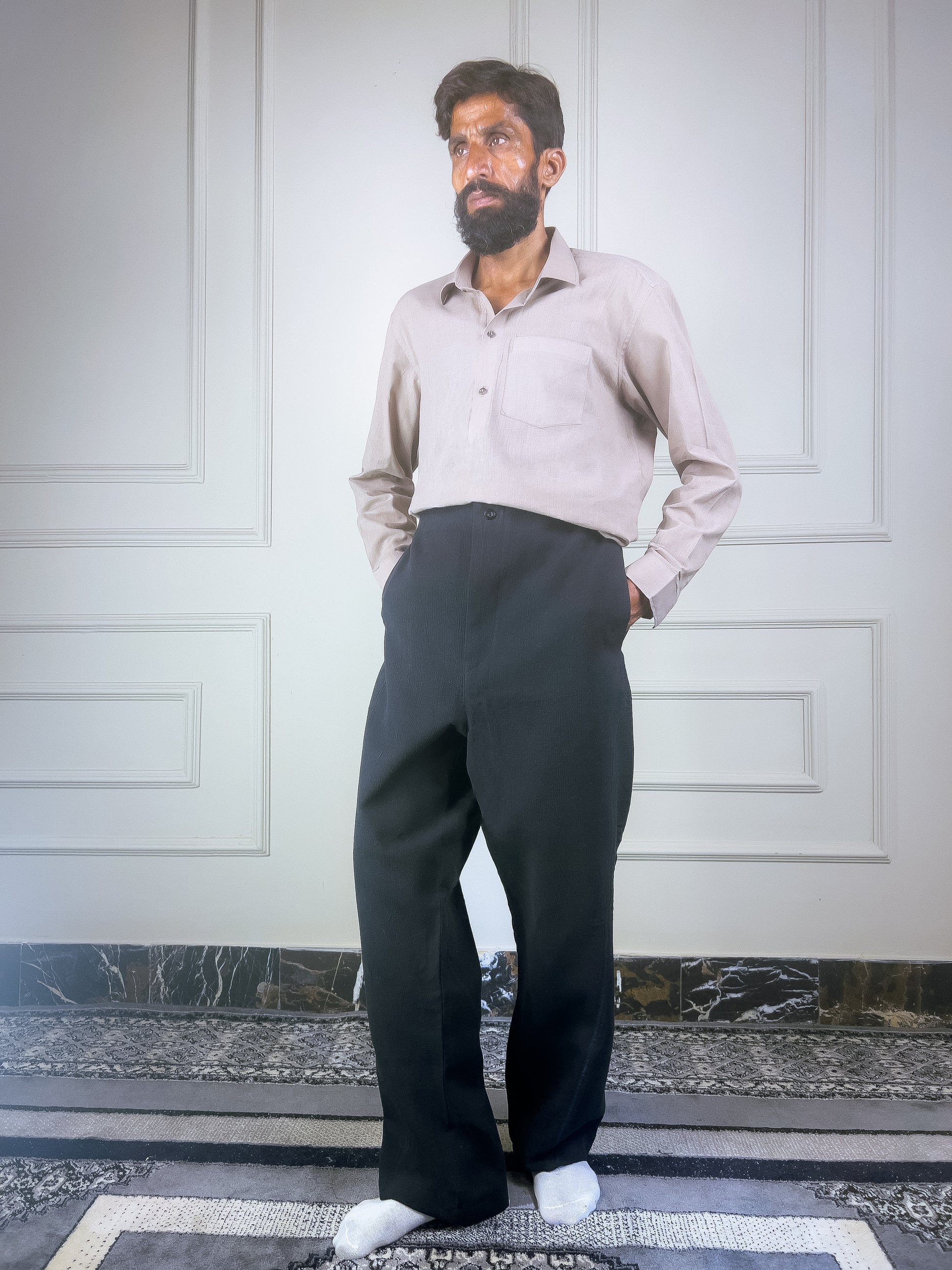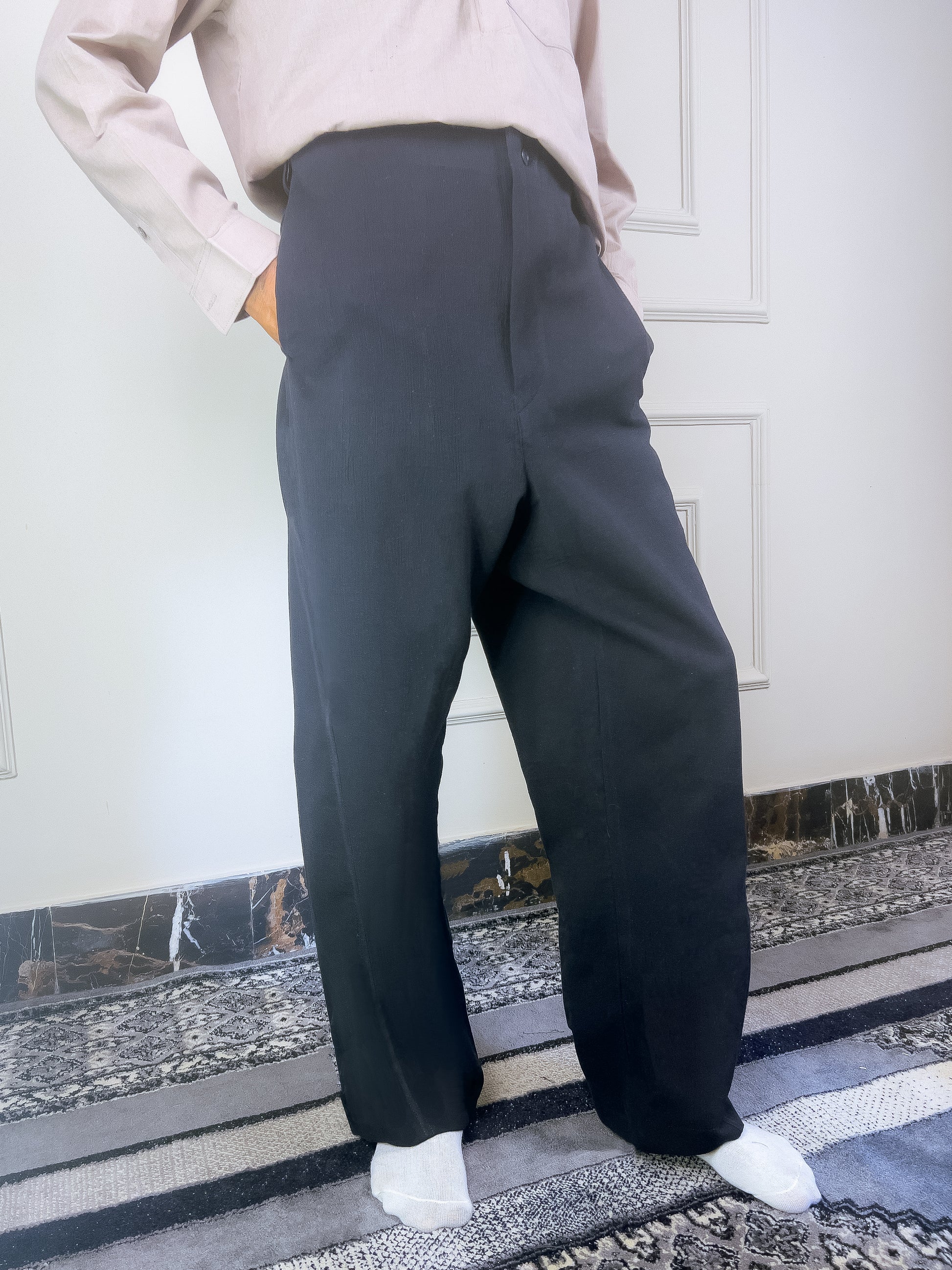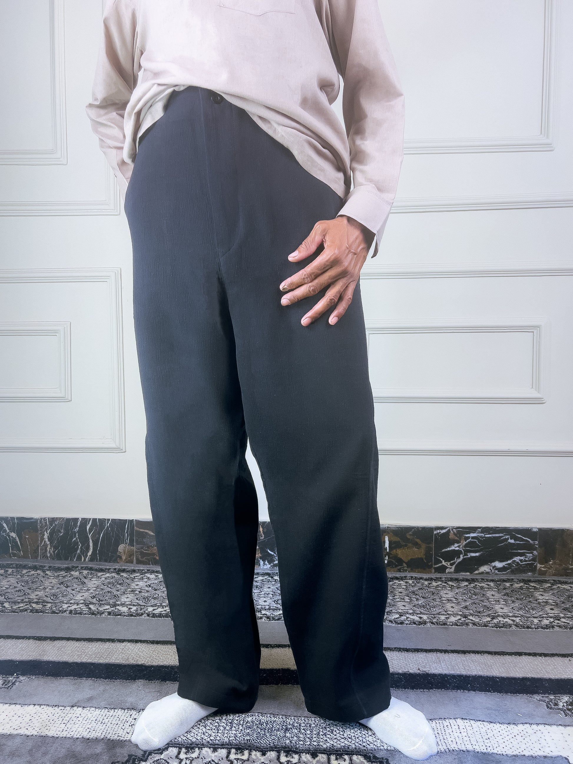 The Kano Twisted Seam Pants feature an off-center seam construction that subtly reshapes the silhouette. Cut from a fused crinkle fabric for structure and movement, this wide-fit style balances concept-driven design with everyday wearability.