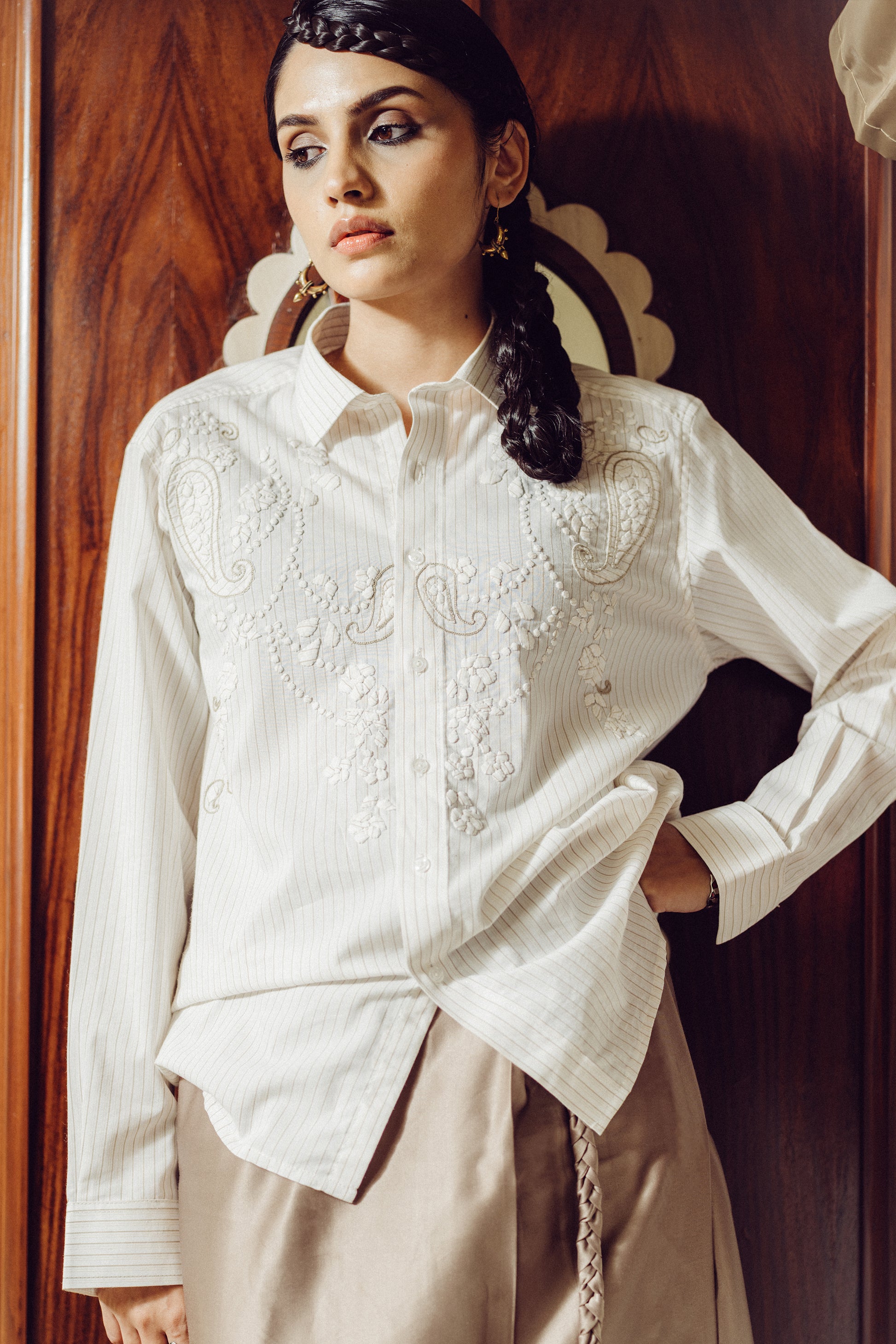 The Mishri Hand Appliqued Shirt showcases intricate contrast ari embroidery and hand applique detailing, celebrating the warmth and individuality of human touch. Crafted with precision by artisans of Rahim Yar Khan, it transforms traditional craft into a modern expression of understated luxury.