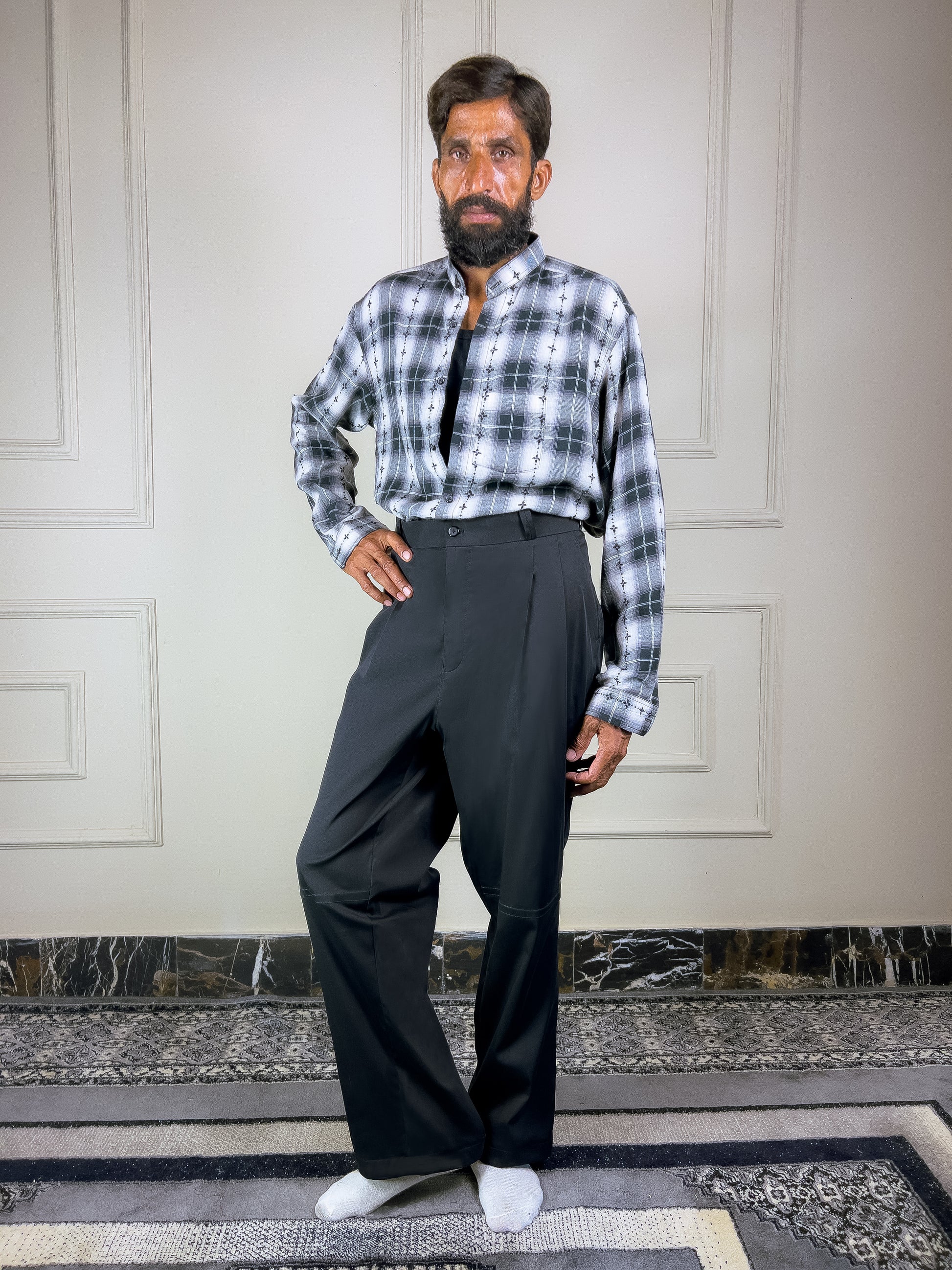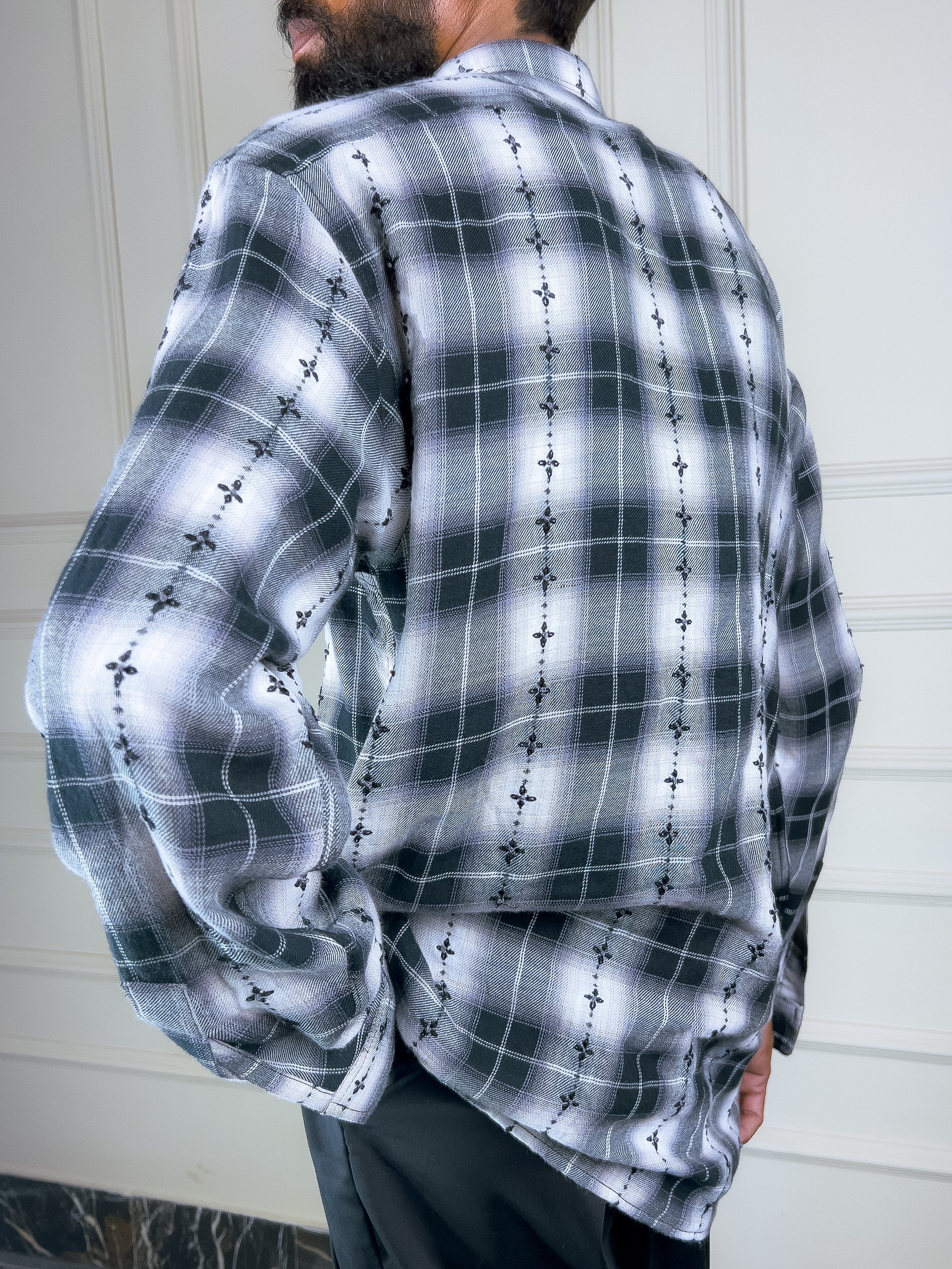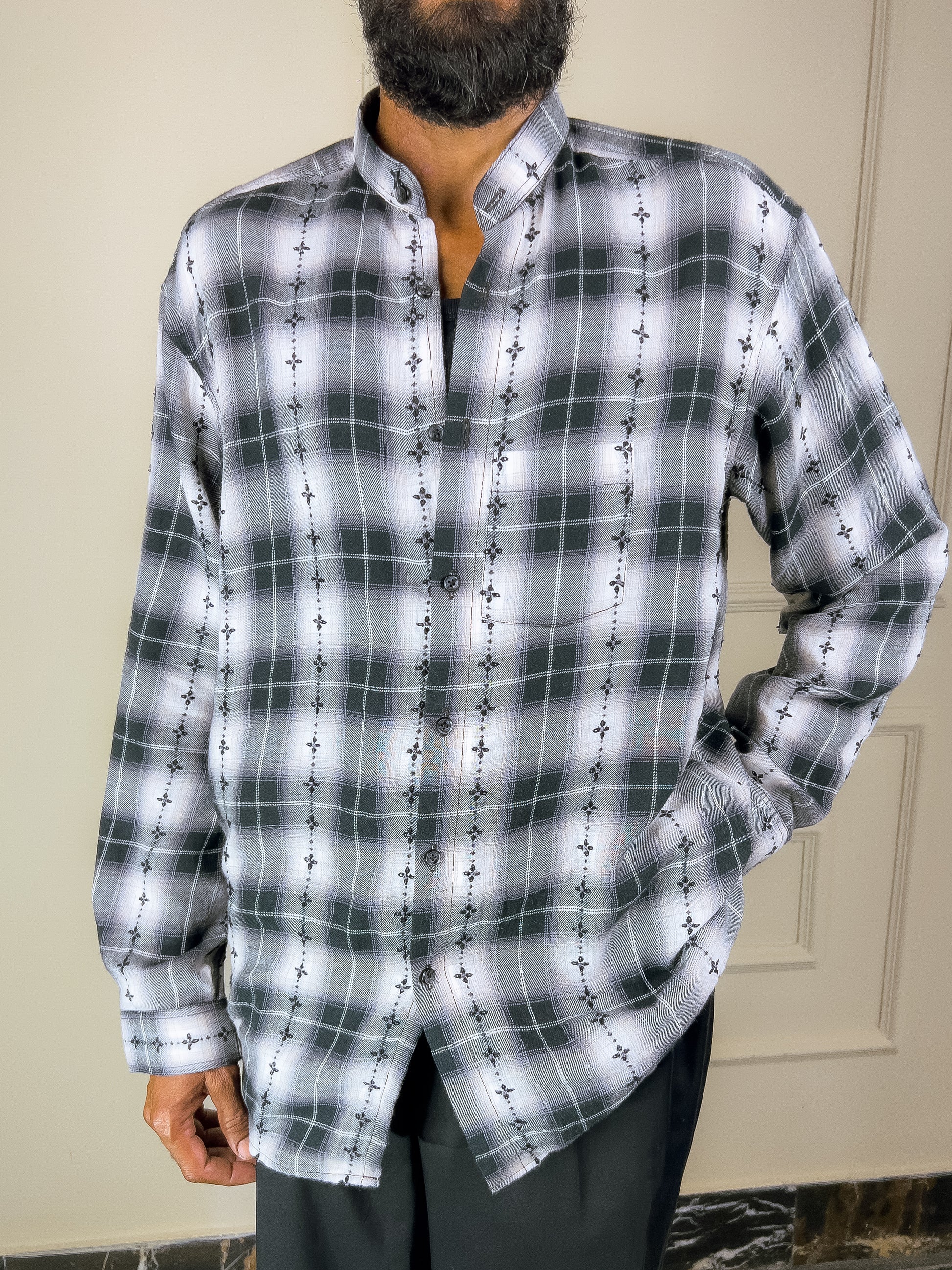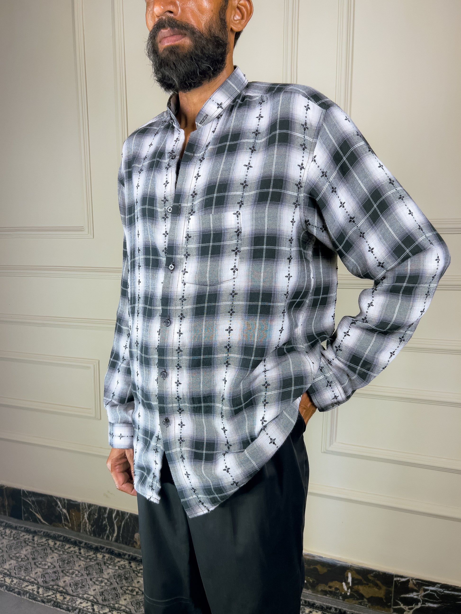 The Phool Hand Embroidered Shirt is a tactile blend of pattern and craft—featuring a hand-woven checkered base layered with floral hand embroidery. Its mandarin collar and clean lines bring balance to this richly detailed piece.