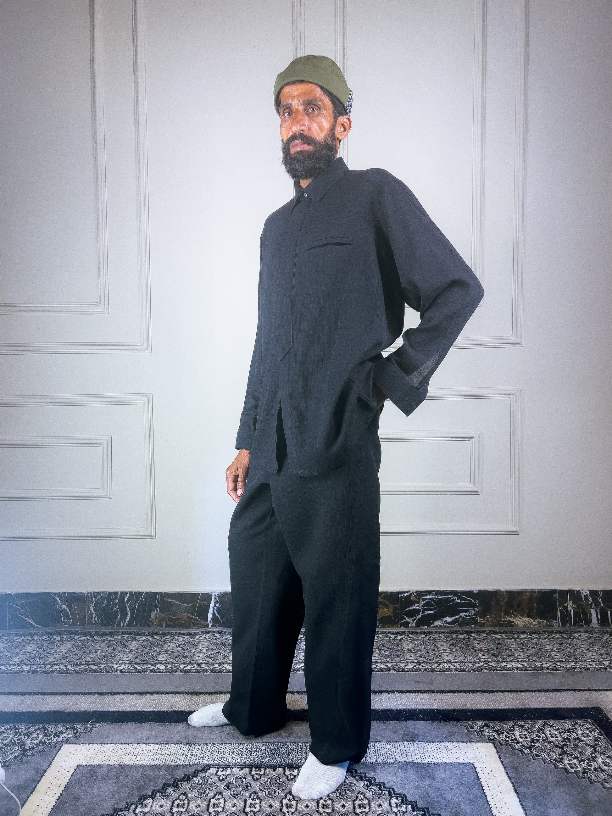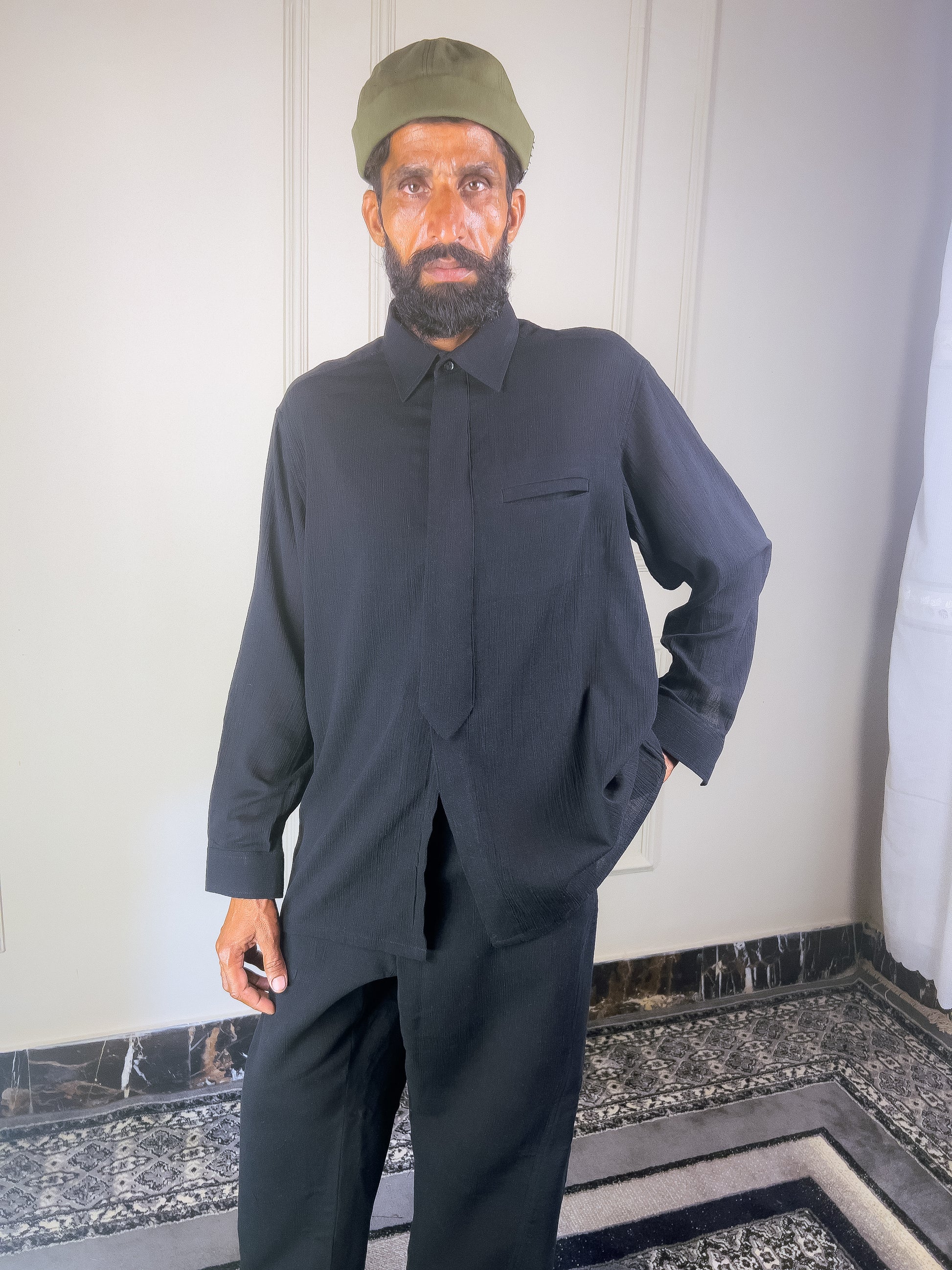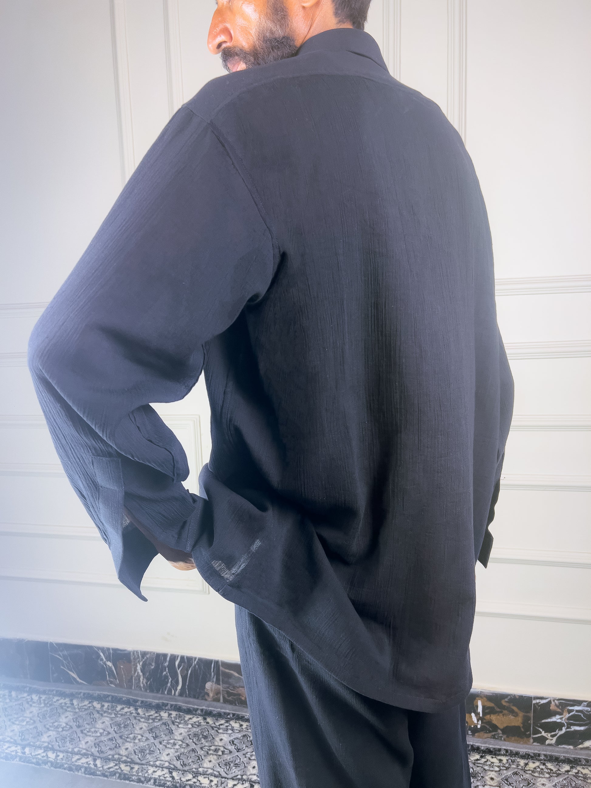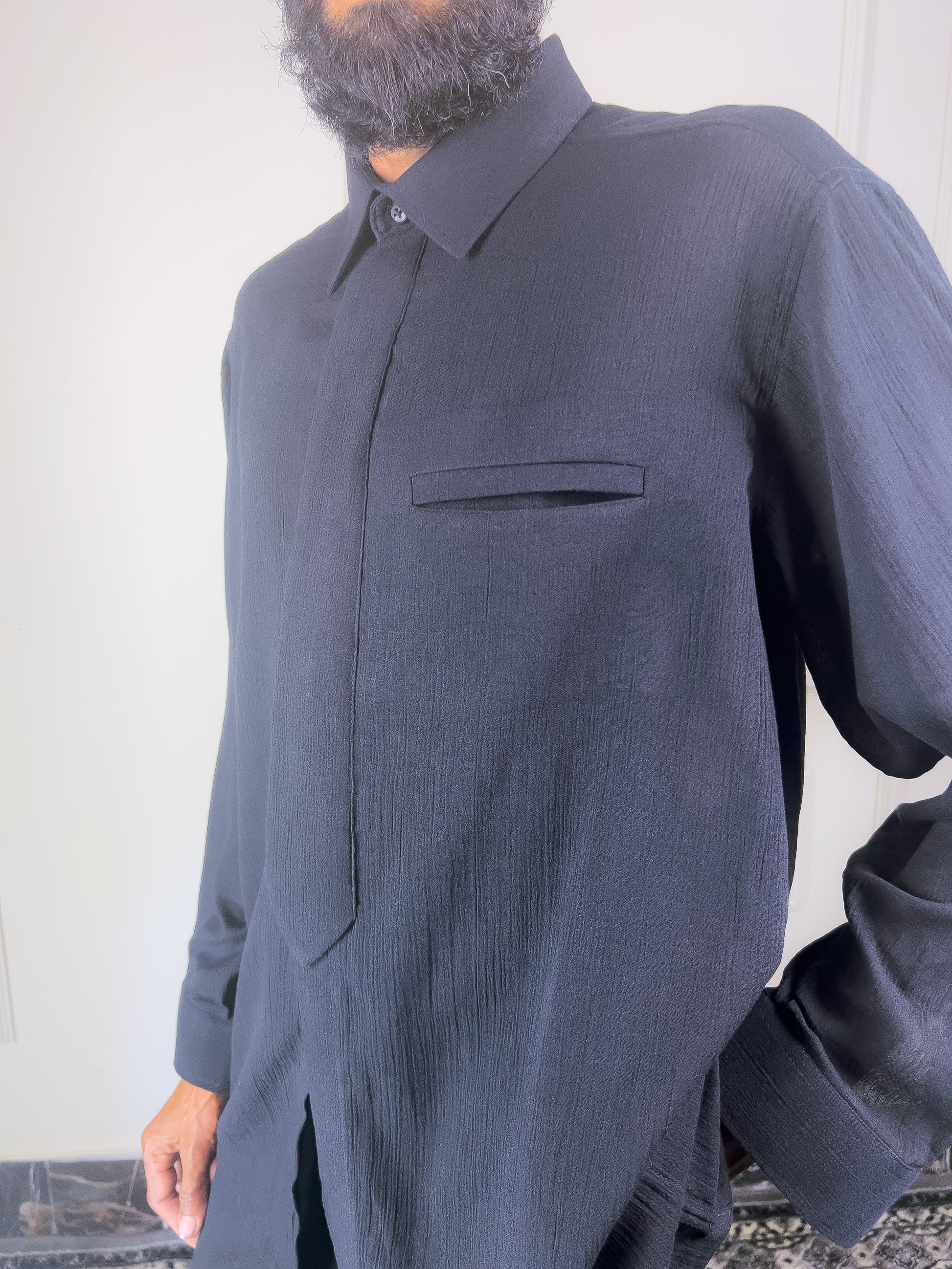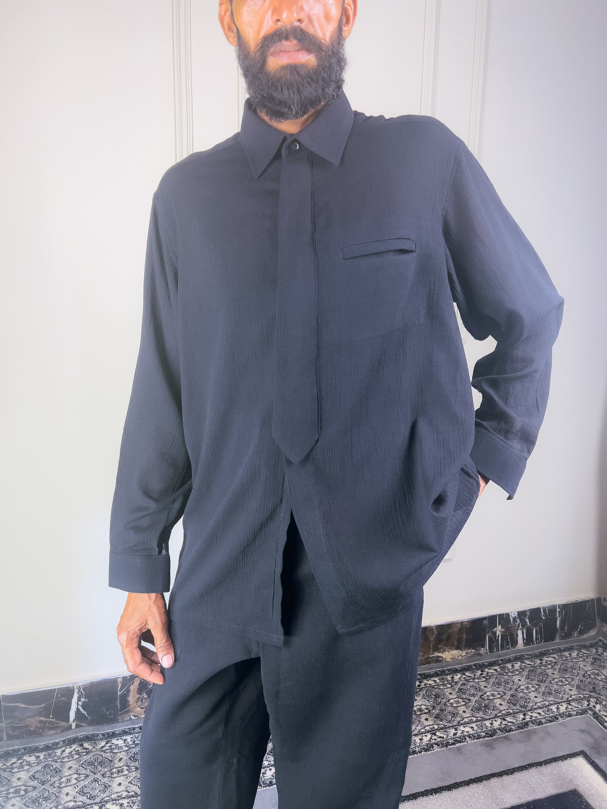 The Sayah Tie Tailored Crinkle Shirt reimagines formal shirting through a textural lens. Made from lightweight crinkle fabric, its tailored silhouette is finished with a minimal tie-front closure—merging ease with quiet sophistication.