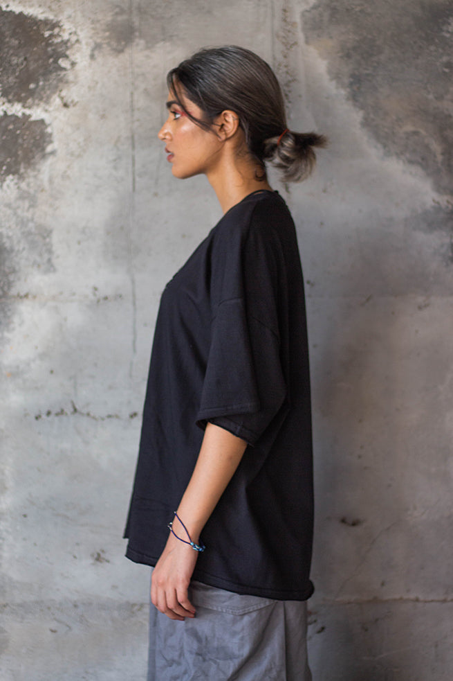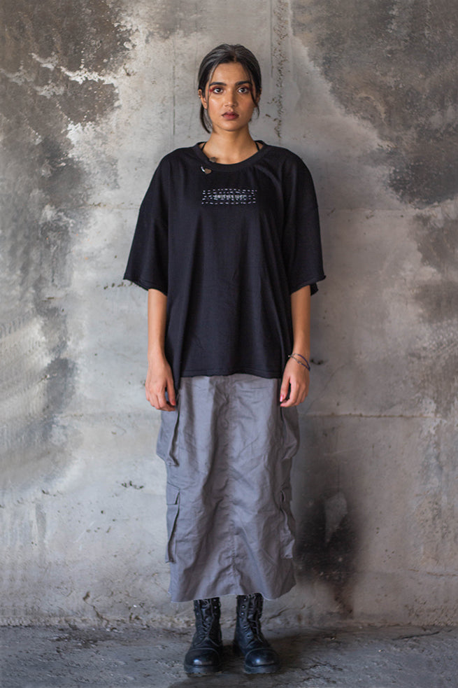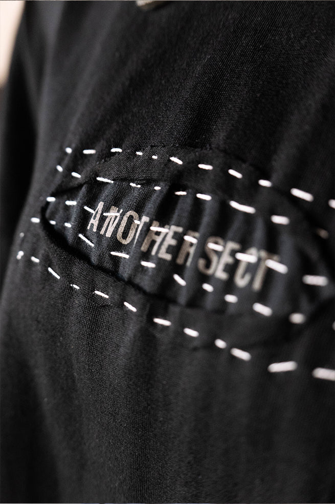 Bracketed hearts T-Shirt with half sleeves and silver plated hearts made in collaboration with zrgr.co,are hand-stitched onto the fabric. Made in premium cotton each shirt has a Another sect hand screen printed with a unique running stitch pattern that was inspired by wabi sabi, an aesthetic choice associated with the urge to fix things so passionately that it becomes toxic.